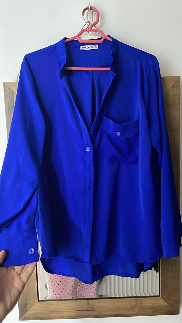 Parlak mavi renkte, yakalı ve uzun kollu kadın gömlek. Düğmeli önü, bol kesimi ve saten dokusu ile rahat ve şık bir tercih.