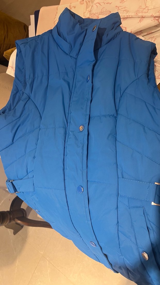 Mavi renkli, düğmeli, yakalı ve kolsuz kadın şişme yelek. Soft fleece kumaştan, midi boyda ve vücuda oturan kesimde, günlük rahat kullanıma uygun.