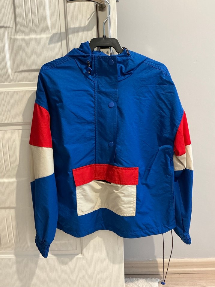 Bu bol kesim kadın ceket, koyu mavi renk ve kırmızı-beyaz detaylara sahiptir. Uzun kollu, düğmeli ve yakalıdır. Yumuşak, sıcak kumaştan üretilmiştir, dış mekan için uygundur. Yarım fermuarlıdır. Ön kısmında kanguru cebi vardır