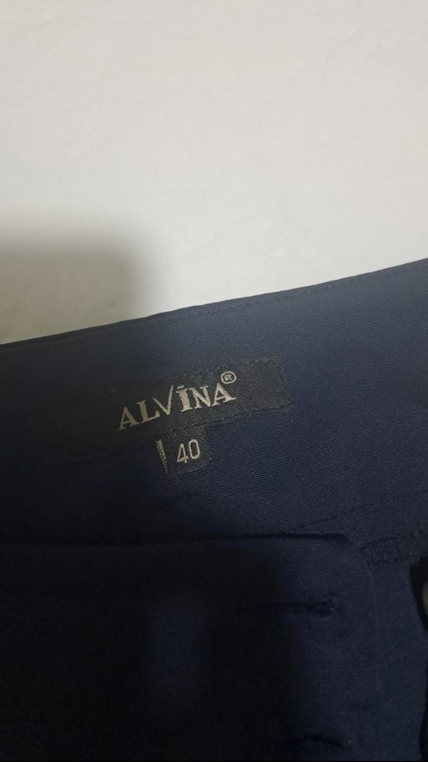 Düğmeli, parlak mavi süet kumaştan kadın cigarette pantolon. Orta boy ve baskılı desenlidir. Ofis kullanımı için uygundur. Marka ALViNA.