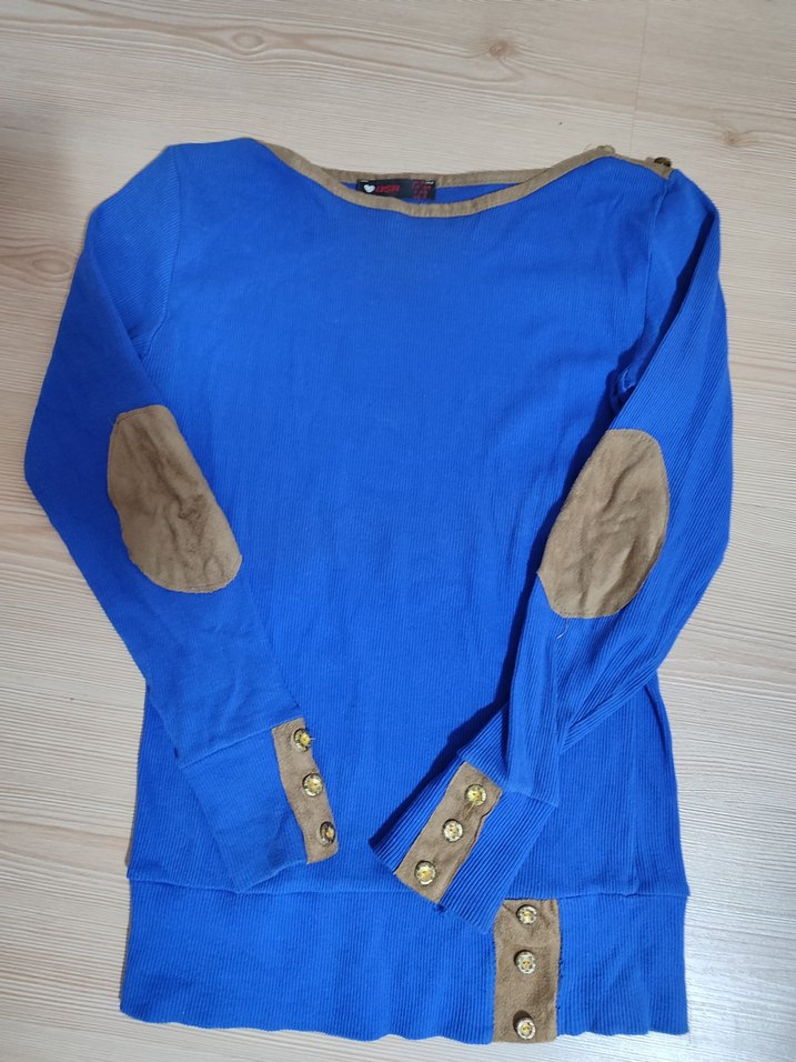 Mavi kadın sweatshirt, uzun kollu ve bisiklet yaka. Manşetlerde ve etek ucunda düğme detayları ile bol kesim ve normal boyda, bej dirsek yamaları bulunur.