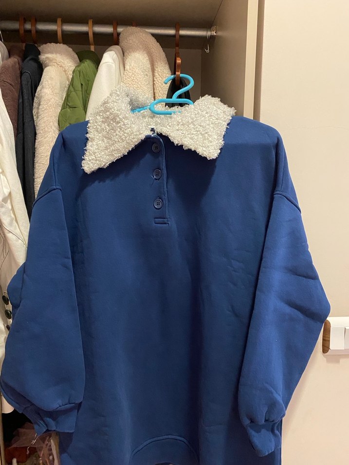 Düğmeli yakalı, uzun kollu mavi kadın sweatshirtü, rahat kesimi ve yumuşak kumaşıyla gündelik kullanım için uygundur. Desensiz ve konforludur. 1-2 defa giydim .