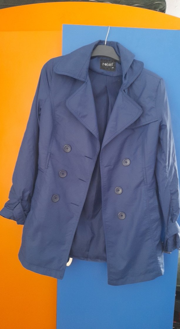 Mavi renkte, düğmeli kadın trençkot. Notch yaka, normal boy ve uzun kolludur. Sentetik kumaştan yapılmış, günlük ve sokak stiline uygundur.