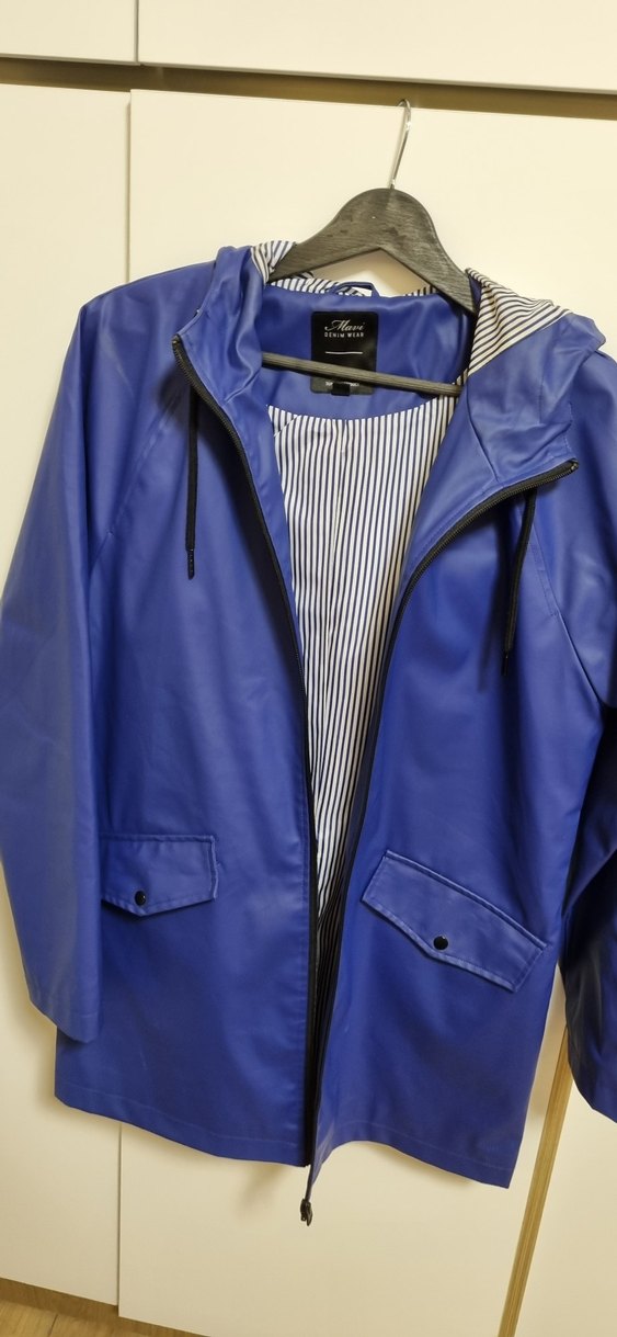 Düğmeli, kapşonlu mavi kadın yağmurluğu, boy 75cm kol altı 48 kol boyu 60 ️