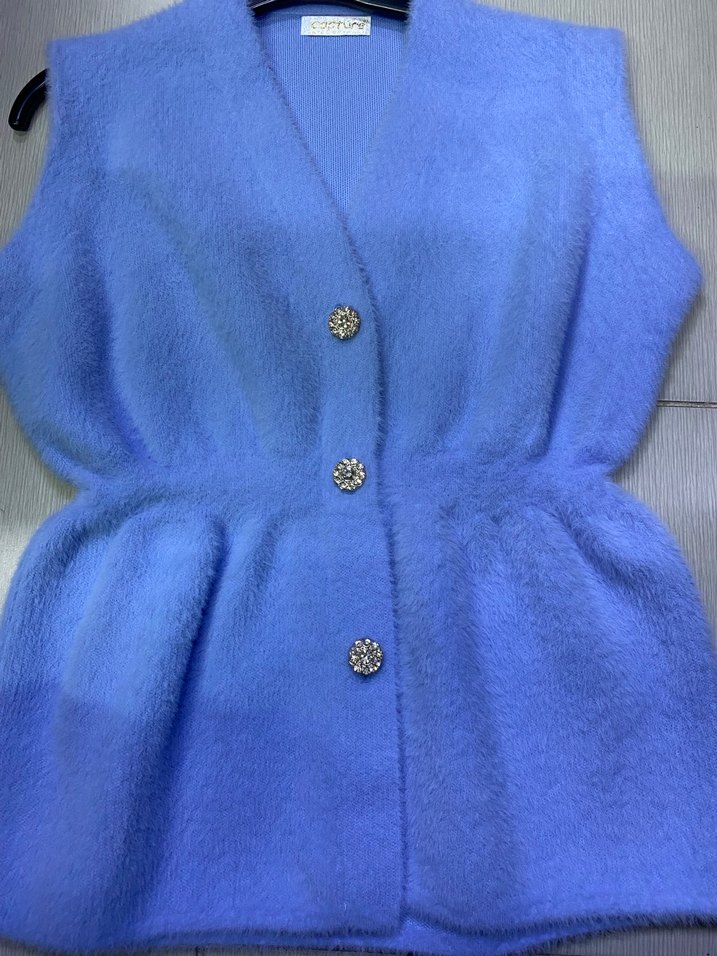 Düğmeli ve kırlangıç yaka detaylı, pastel mavi renkli, yumuşak ve sıcak dokulu kadife kumaştan üretilmiş, rahat kesim ve kolsuz kadın yelek.