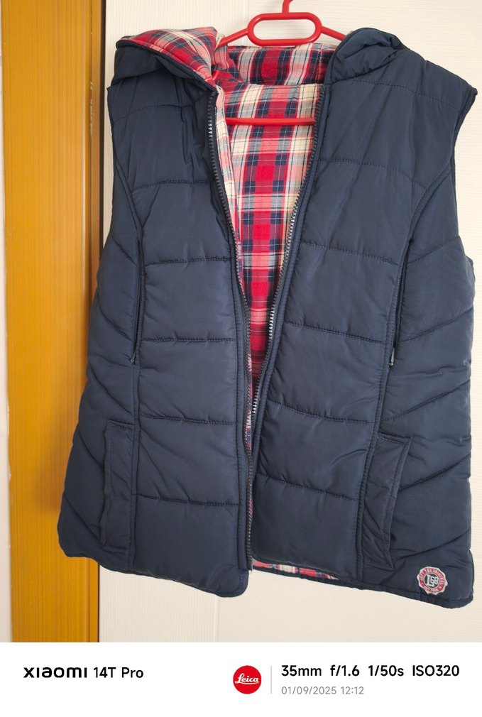 Düğmeli, kapüşonlu ve çıtçıtlı, parlak mavi renkte, kareli iç astarlı, normal midi boyda, kadın yelek.