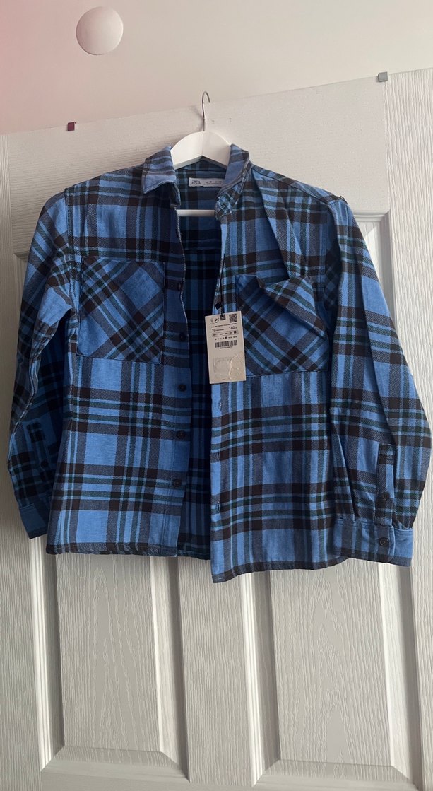 uzun kollu, düğmeli, mavi kareli denim gömlek. Salaş kesim ve notched lapel yaka ile günlük sokak tarzı için uygundur.