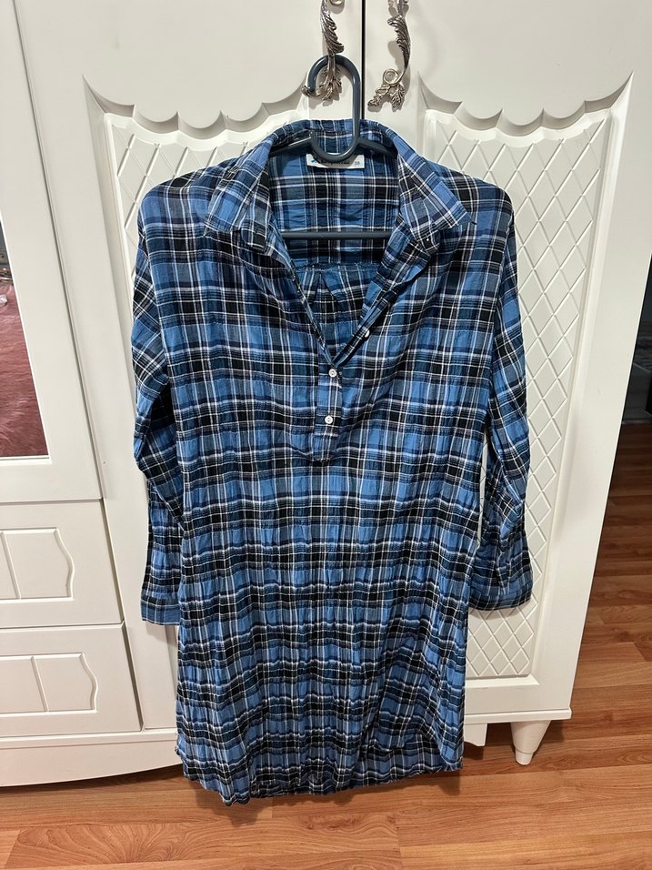 yakalı ve uzun kollu, bol ve midi boyda kesime sahiptir. Yumuşak keten kumaştan üretilmiş olup koyu mavi kareli deseni vardır. Düğmeli ön kısmı ile rahat ve günlük kullanıma uygundur.
