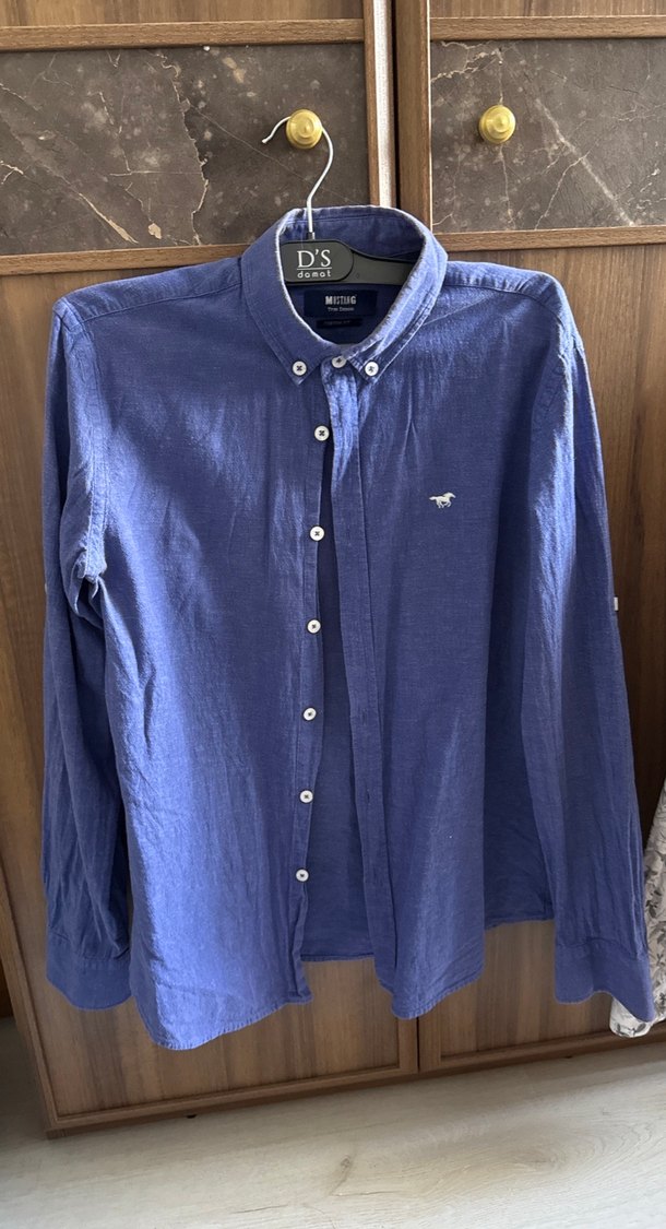 Düğmeli, uzun kollu keten erkek gömlek, parlak mavi renkte ve regular fit kesimde. Günlük rahat kullanıma uygun, D'S markalı.