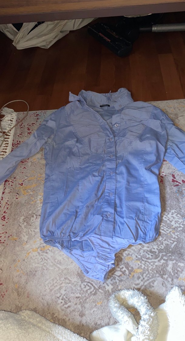 Düğmeli, yakalı ve uzun kollu mavi keten gömlek, günlük kullanıma uygun rahat bir sokak stili sunar.
