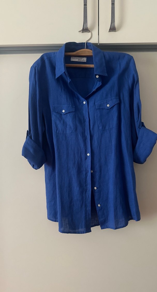 Düğmeli, uzun kollu, yakalı mavi keten gömlek. Rahat kesimi ve cep detaylarıyla günlük kullanıma uygun.