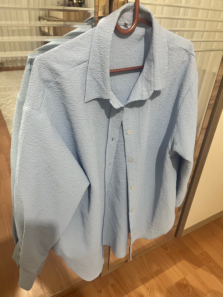 Mavi keten gömlek, düğmeli ve notched lapel yakaya sahiptir. Uzun kollu, normal kesim ve midi boyda, günlük kullanıma uygundur.