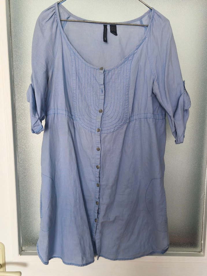 Pastel mavi keten kumaştan, düğmeli, kısa kollu, salaş kesim hamile tunik. Bohem tarzıyla günlük kullanıma uygundur.