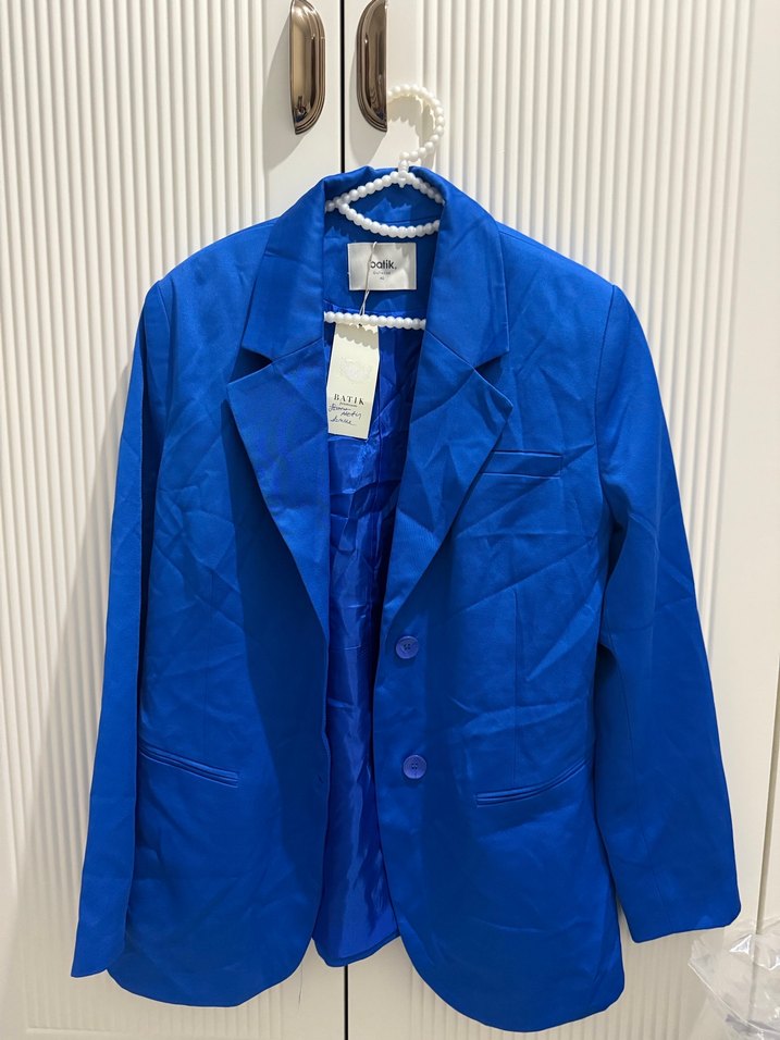 Düğmeli önü, kesimli yakası ve uzun kollu mavi keten blazer ceket. Normal boy ve regular fit, parlak dokusu ile ofis ve günlük şıklık için uygun.
