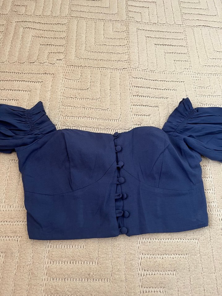 Lacivert keten kumaştan, düğmeli ve boğaz yaka detaylı, vintage bohem tarzda, dar kesim ve askılı kollu kadın bluz. Hiç kullanılmadı