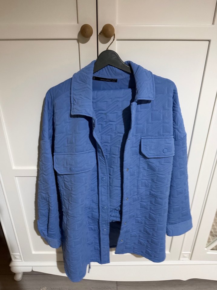 Düğmeli, keten kumaştan, uzun kollu, mavi renkli, rahat kesim kadın ceket. Günlük kullanıma uygun, sokak stili detaylı.