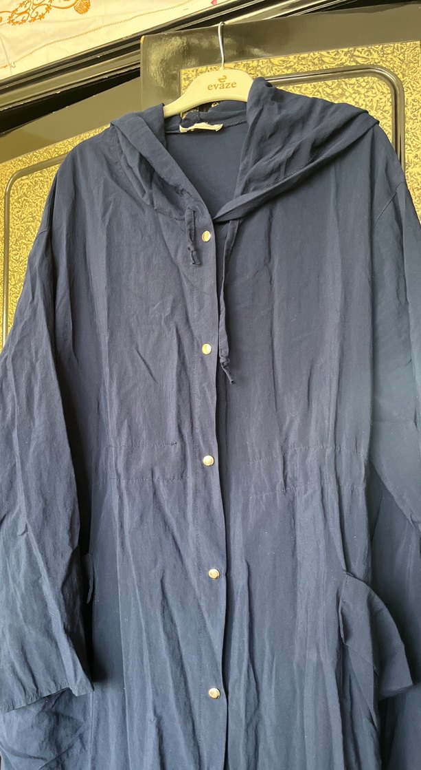 Mavi keten kumaştan, düğmeli, uzun kollu, normal midi boyda, notched lapel yakalı, salaş kesim kadın ceket. Günlük kullanıma uygundur.