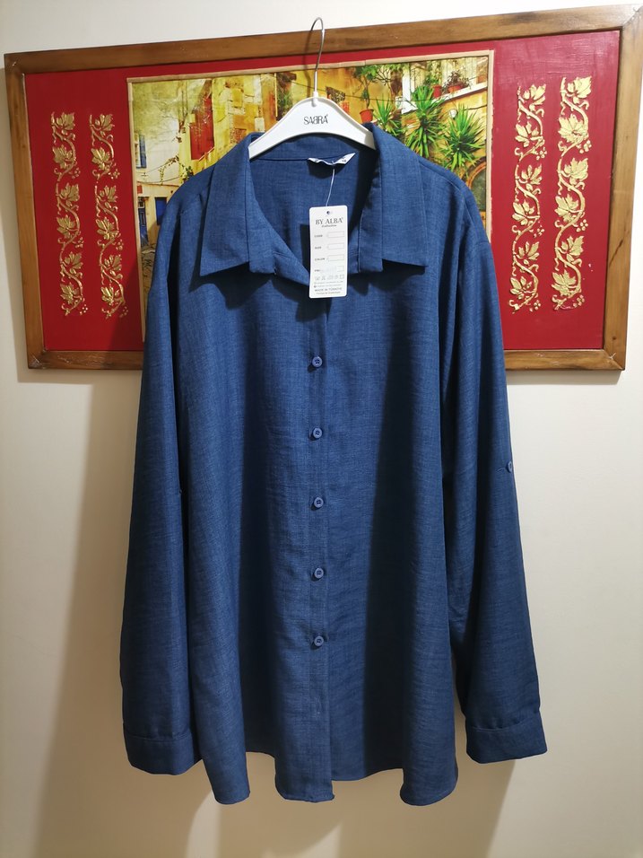 Uzun kollu, düğmeli, keten kumaştan mavi gömlek. Normal midi boyda, rahat kesim ve kesik yaka detaylı, ofis ve günlük kullanım için uygun. Bedeni 58.gömleğin göğüs 68 boy 79 cm. Pantolon yandan boyu 106 cm, basen 68 cm