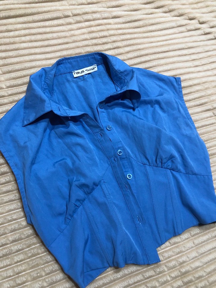 Düğmeli, kısa kollu, yakalı mavi keten gömlek. Rahat kesimi ve parlak görünümüyle günlük kullanıma uygundur. rengi biraz koyu çıkmış normalde daha açık mavi