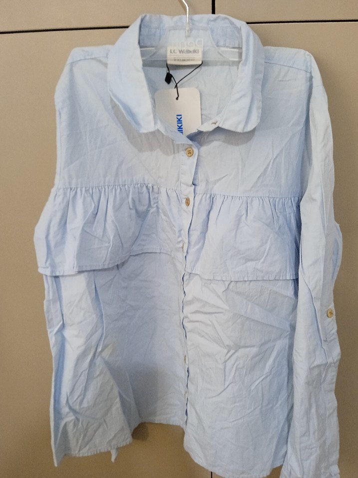 Mavi keten kumaştan, düğmeli, yakalı ve uzun kollu, bol kesim midi boy kadın gömleği. Günlük sokak stili için uygundur.