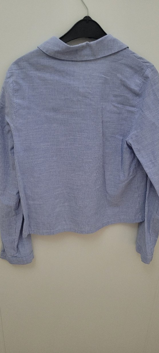 Mavi keten kadın gömlek, düğmeli ve yakalıdır. Uzun kollu, gevşek kesim ve normal uzunluktadır, gündelik kullanıma uygundur.