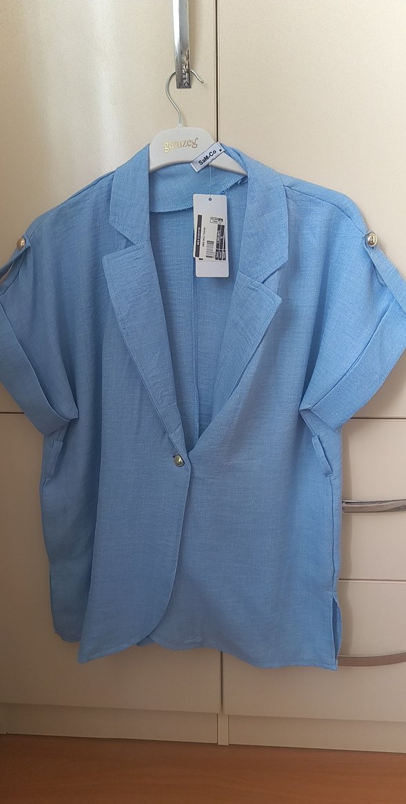 Mavi keten gömlek, düğmeli, kısa kollu ve notched lapel yakalıdır. Normal uzunlukta ve regular fit kesimlidir, ofis için uygundur.