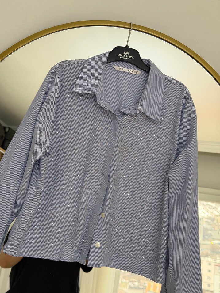 Düğmeli, keten kumaştan, uzun kollu ve çıtmalı yakalı mavi gömlek. Rahat kesimli, günlük için uygun.