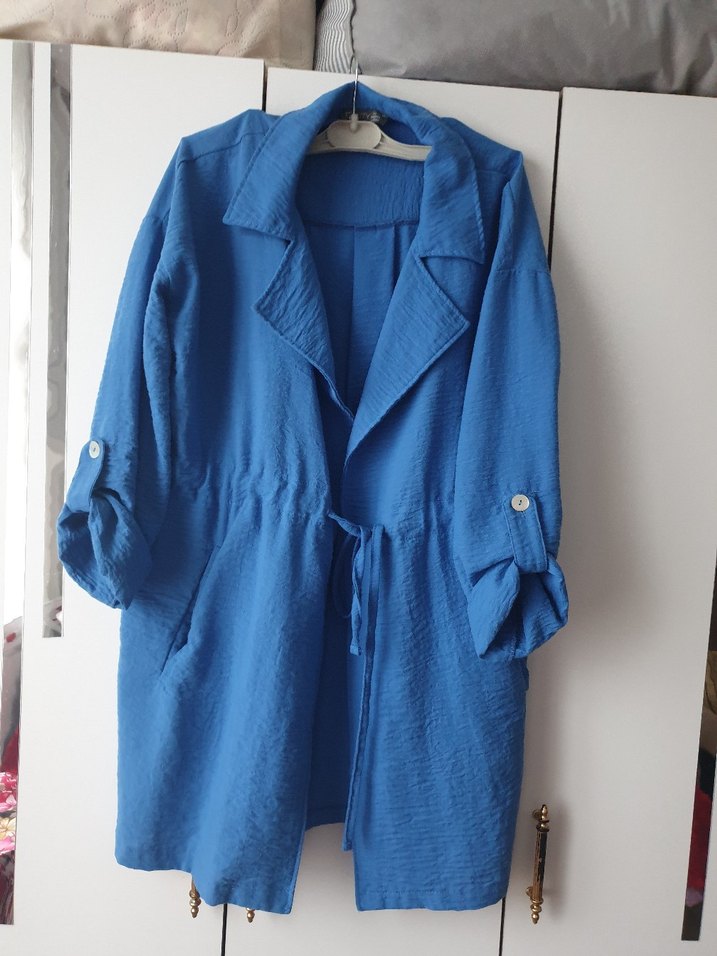 Mavi keten kumaştan, düğmeli ve yakalı, uzun kollu, bol midi ceket
