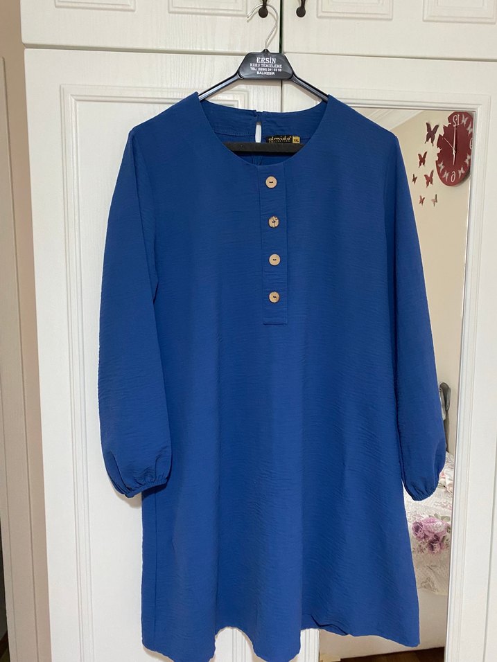 Mavi keten kumaştan, düğmeli, yuvarlak yakalı, uzun kollu ve bol kesimli midi boy kadın tunik. Minimalist ve trend günlük stil için uygun.