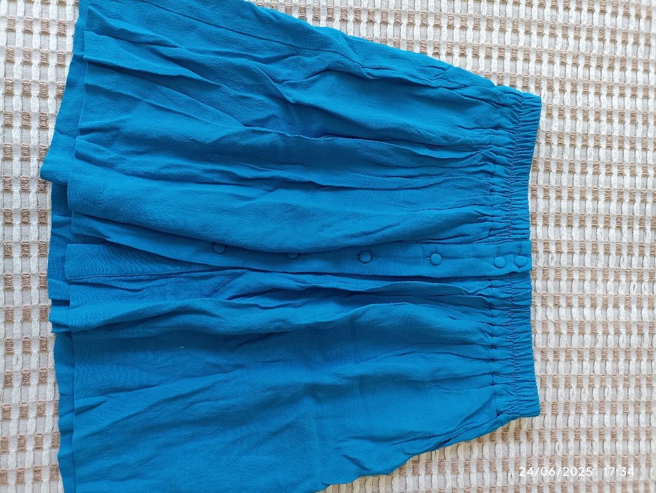 Düğmeli, bol kesim, parlak mavi keten kısa etek. Bohem tarzıyla dış mekan kullanımı için uygundur.
