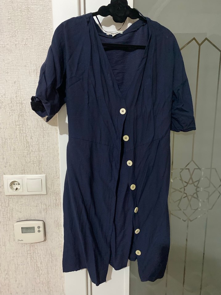 Düğmeli ön kısmı ve V yakası olan, kısa kollu, koyu mavi keten kumaştan bol kesim midi elbise.