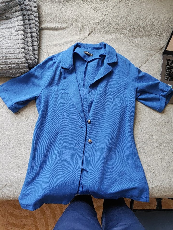 Düğmeli, keten kumaştan, parlak mavi renkte, normal boy midi gömlek. Kısa kollu ve kesik yakalı, rahat kalıp.