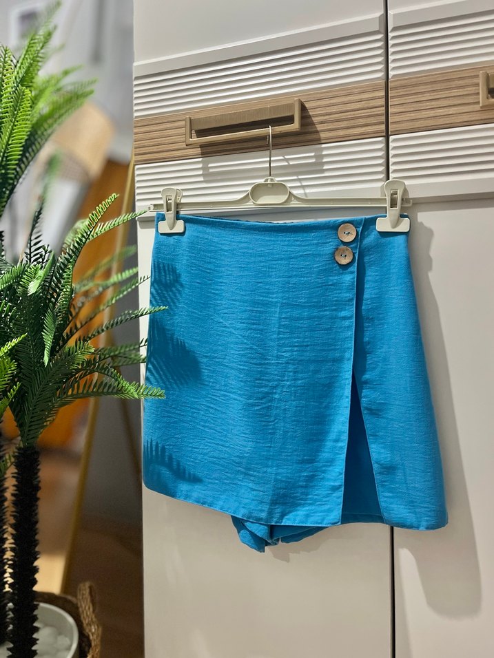 Düğmeli detaylı, keten kumaştan mavi mini şort. Bol kesim ve minimalist bohem tarzıyla günlük kullanıma uygun.