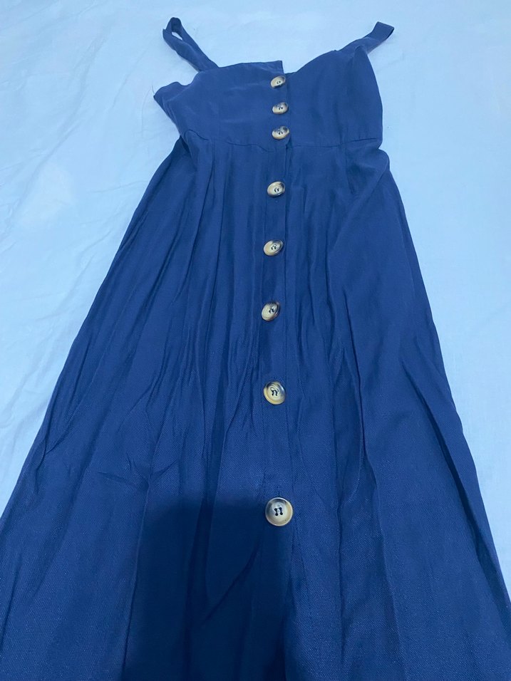 Düğmeli önü ve kesik yaka detaylı, mavi keten kumaştan, salaş kesimli, kolsuz uzun elbisedir. Minimalist bohem tarz sunar.
