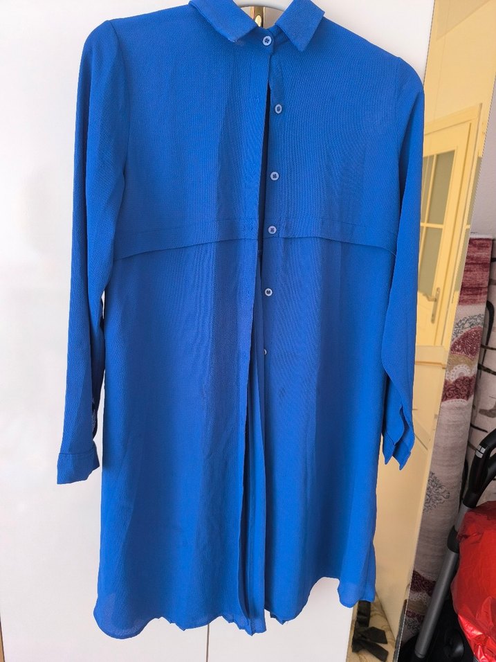 Düğmeli, yakalı uzun kol ve bol kesim mavi keten tunik. Parlak dokusu ile ofis ve günlük kullanıma uygun rahat bir seçenek.