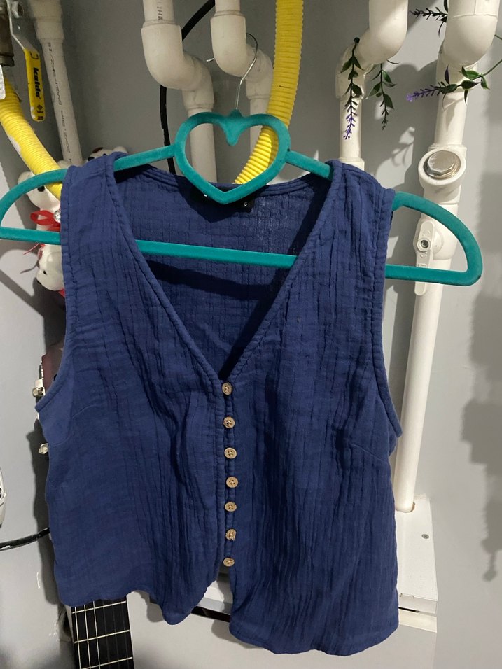 Koyu mavi renkte, keten kumaştan yapılmış, düğmeli ve V yaka, bol kesim midi uzunlukta kadın yeleği. Rahat ve günlük kullanıma uygun.