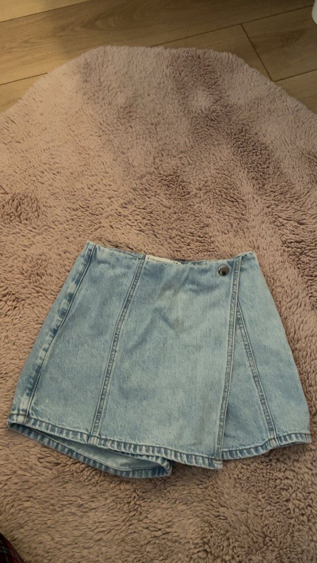 Düğmeli, bol kesim, pastel mavi tonlarında kısa kadın denim şort. Günlük kullanıma uygun rahat ve sokak tarzı bir model.