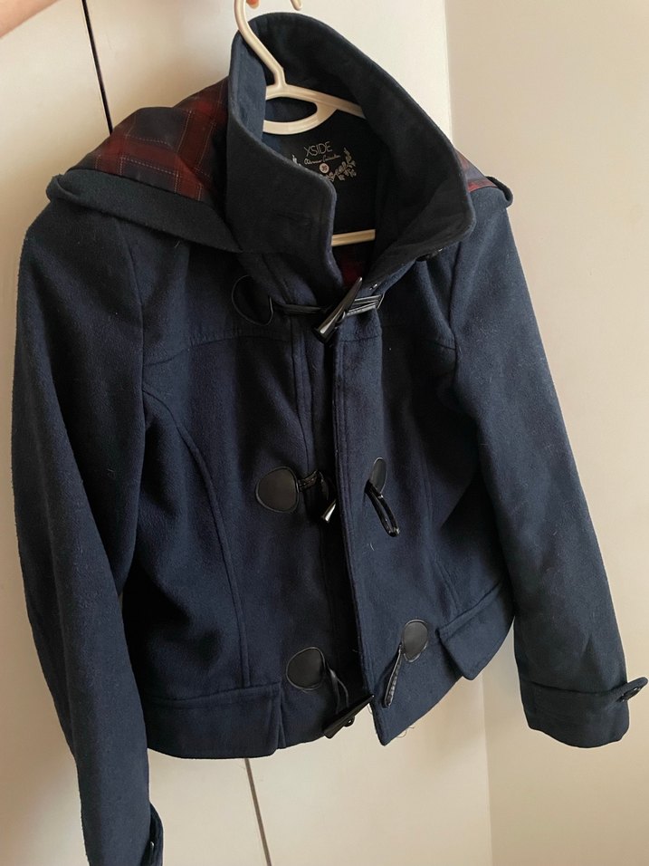 Düğmeli, uzun kollu, kesimi vücuda oturan crop uzunlukta mavi kaban. Yumuşak ve sıcak kumaştan, rahat ve gündelik sokak stili için uygundur.