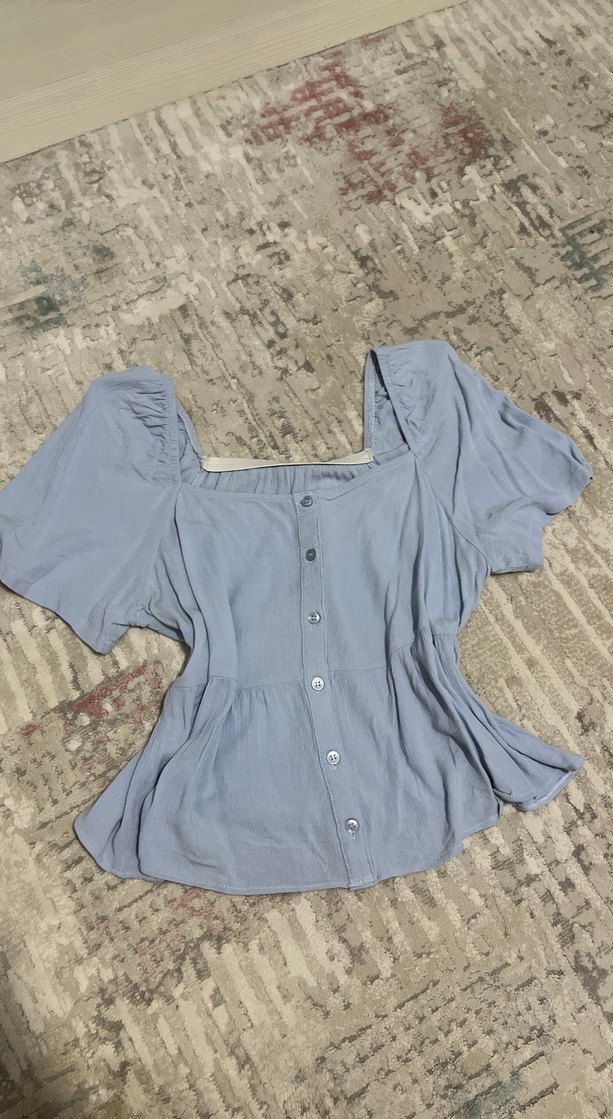 Düğmeli ve kısa kollu, rahat kesim mavi bluz. Yumuşak keten kumaştan, tek renk ve tekne yaka, günlük sokak stili için uygun.