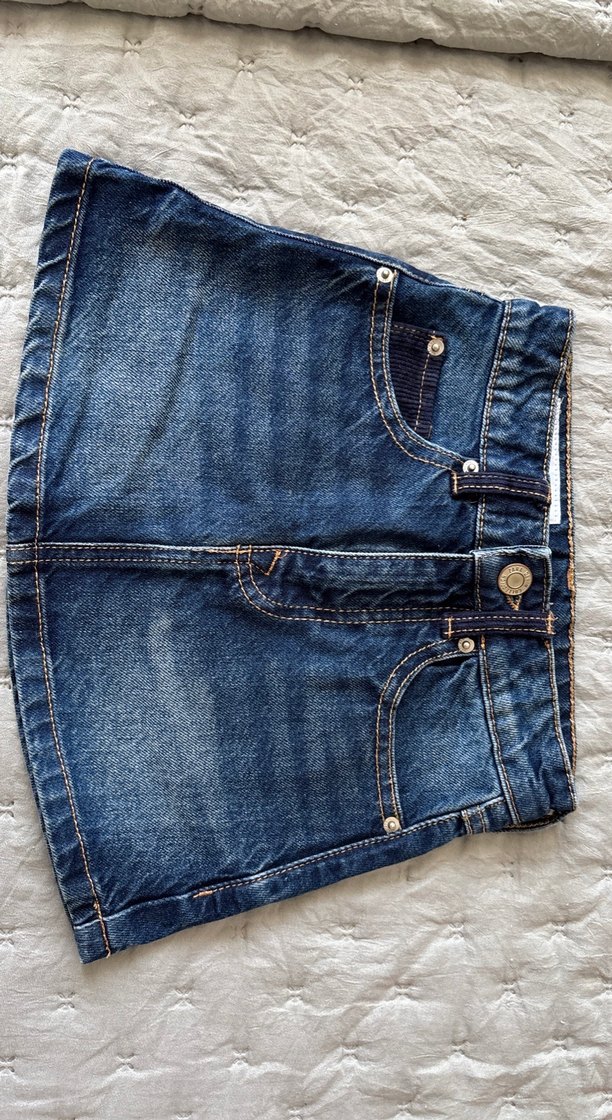 Düğmeli, bol kesim mavi kot kumaştan kız çocuk eteği, sade ve sokak stiline uygun.