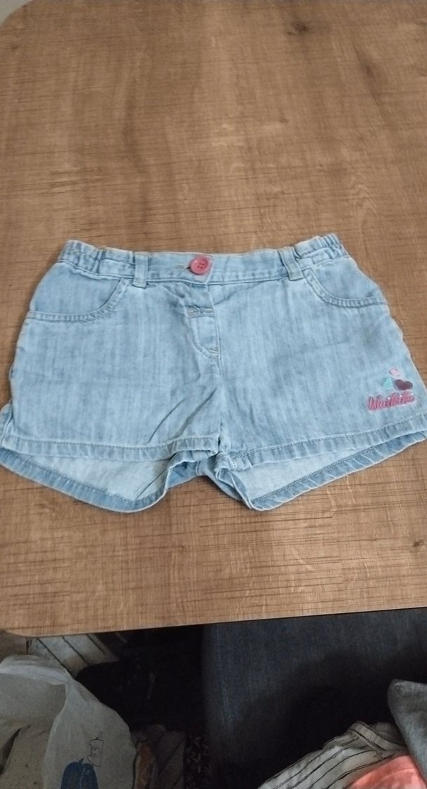 Düğmeli, bol kesim, pastel mavi renkte kızlar için denim şort. Sokak stiline uygun rahat ve günlük kullanıma uygun.