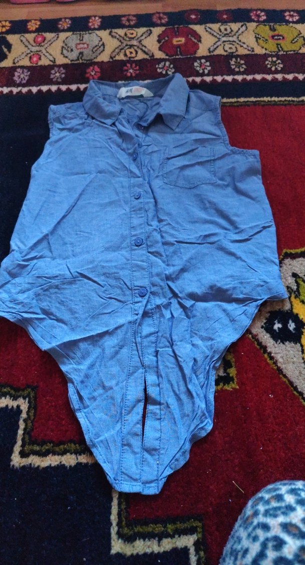 Düğmeli ön kısmı, yakalı ve kolsuz tasarımıyla mavi gömlek, rahat kesim ve normal midi boyuyla günlük kullanıma uygundur.
