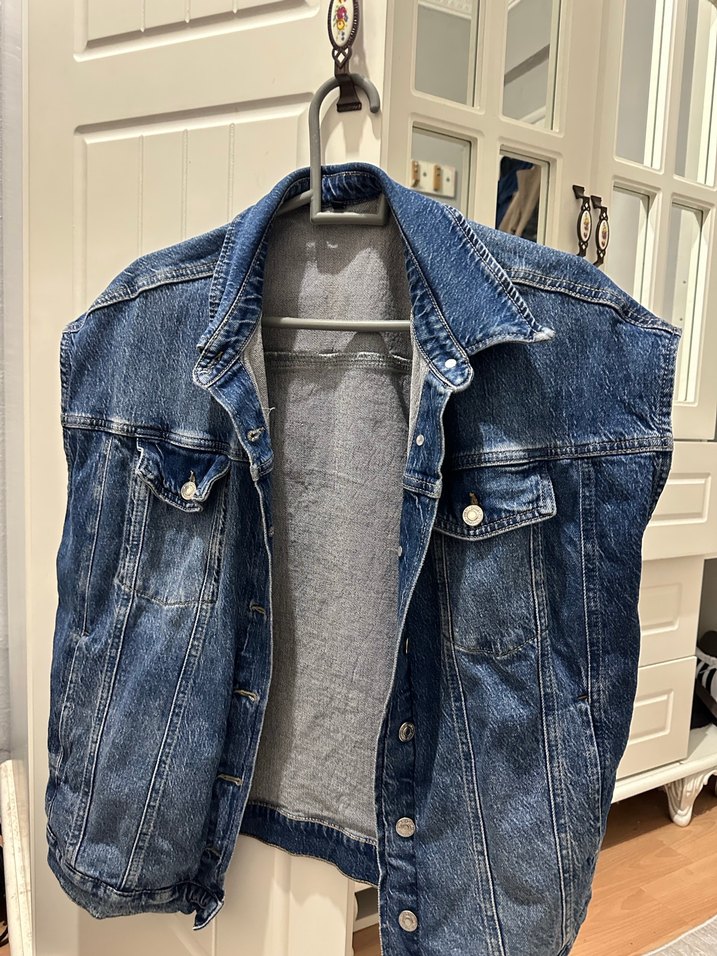Düğmeli, kolsuz, bol kesim mavi kot yelek. Normal boyda, straplez yakalı, günlük kullanıma uygun rahat bir tarz sunar.