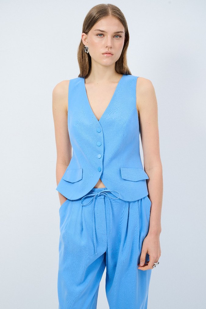 Düğmeli Mavi Kolsuz V Yaka Kadın Yelek