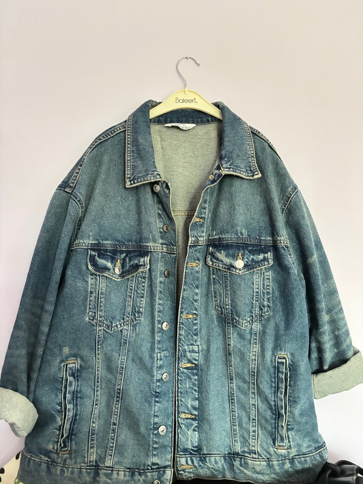 Düğmeli, geniş kesim kadın denim ceketi, gri-mavi renkte, normal boyda .Günlük kullanım için rahat ve sokak tarzına uygun.