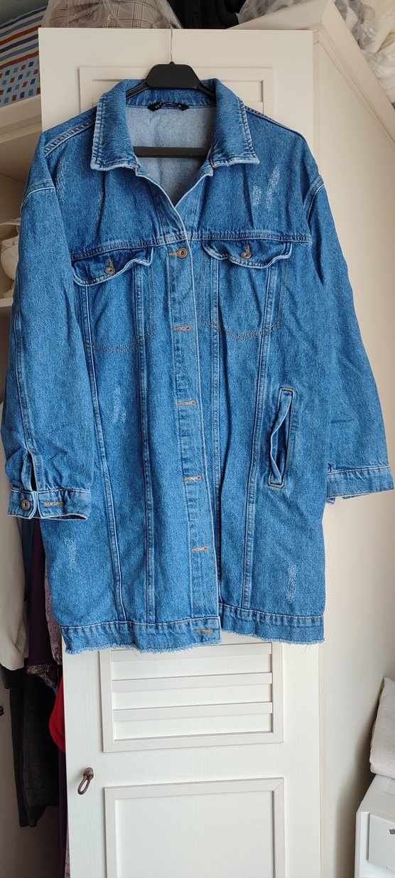 Düğmeli, uzun kollu, normal midi boyda, bol kesim mavi kot ceket. Notlu yaka ve günlük rahat sokak stili için uygundur. ✨