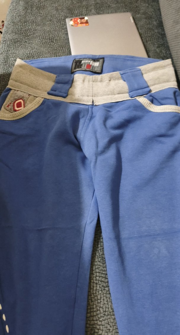 Düğmeli detaylara ve rahat bir bele sahip, kot kumaştan yapılmış mavi eşofmanı. Günlük kullanım için uygundur.