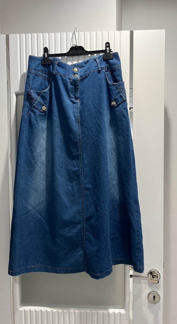 Düğmeli cep detaylı, bol kesim mavi kot etek 42 Beden