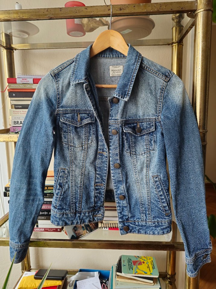 Düğmeli, uzun kollu, yakalı ve fitted kesimli mavi denim ceket, günlük kullanım için uygun rahat bir sokak stili ürünü. XS bedendir. Mango, defosuz.
