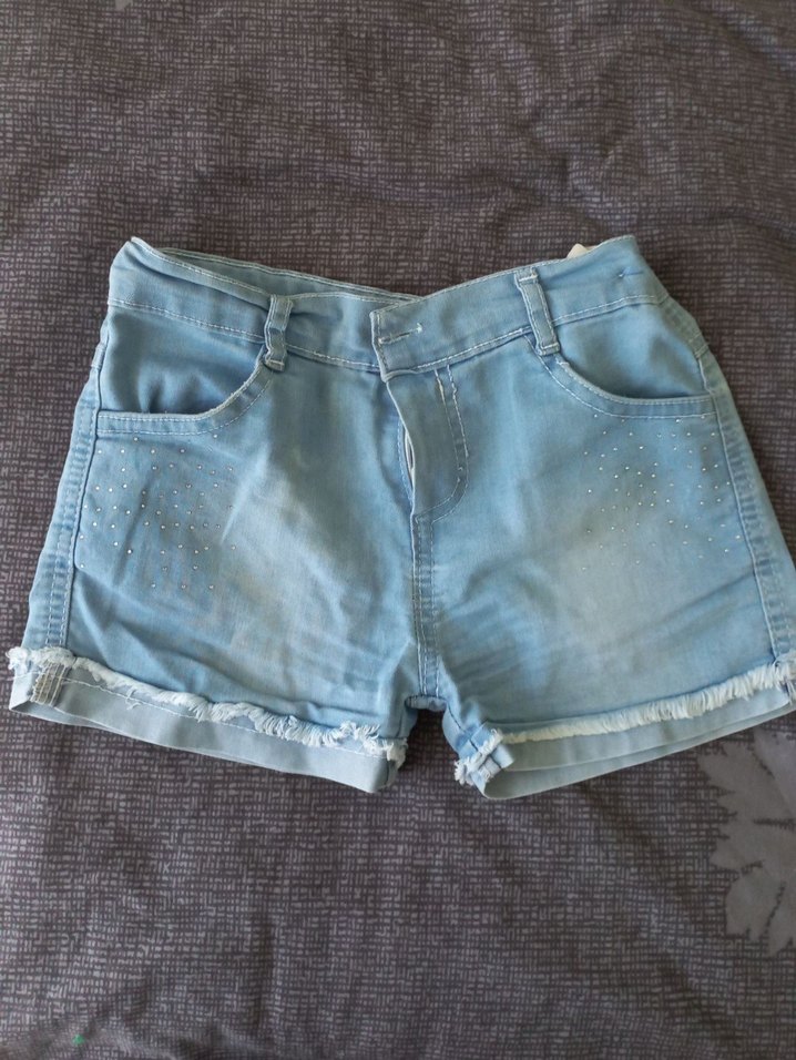 Düğmeli, rahat kesim mavi kot kız şortu, hafif süslemelerle sokak stiline uygun.